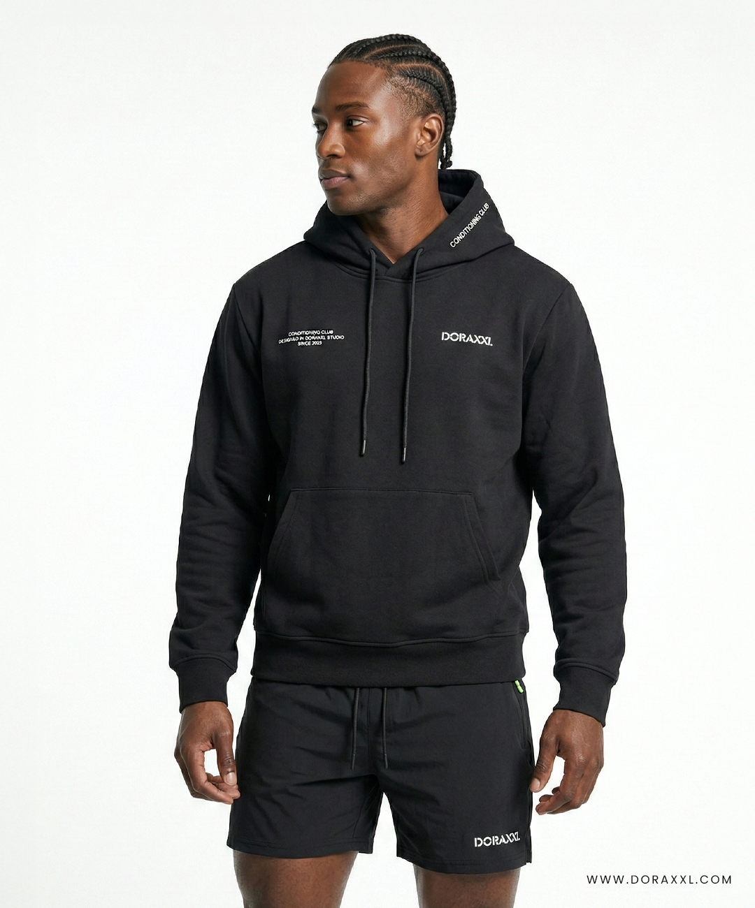 Bold, confident, and effortlessly modern, the Conditioning Club Hoodie is designed for movement and everyday edge. The deep-black hoodie features a relaxed fit with subtle branding and a clean, structured hood, offering both comfort and attitude. Paired with form-fitting black shorts, the look highlights a strong, athletic silhouette while remaining versatile enough for casual wear or active days. Minimalist in design yet powerful in presence, this set embodies contemporary streetwear with a refined, confident energy.