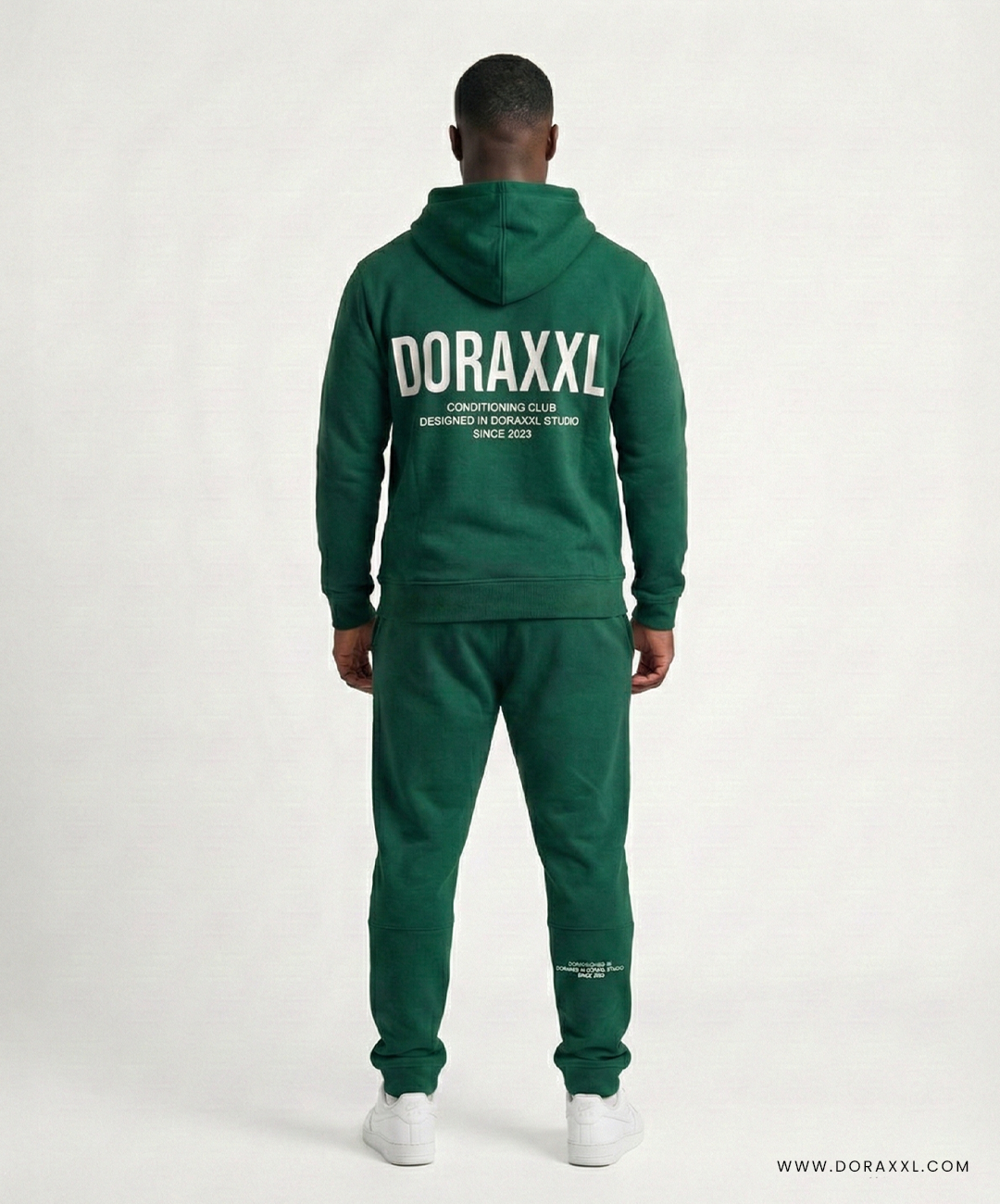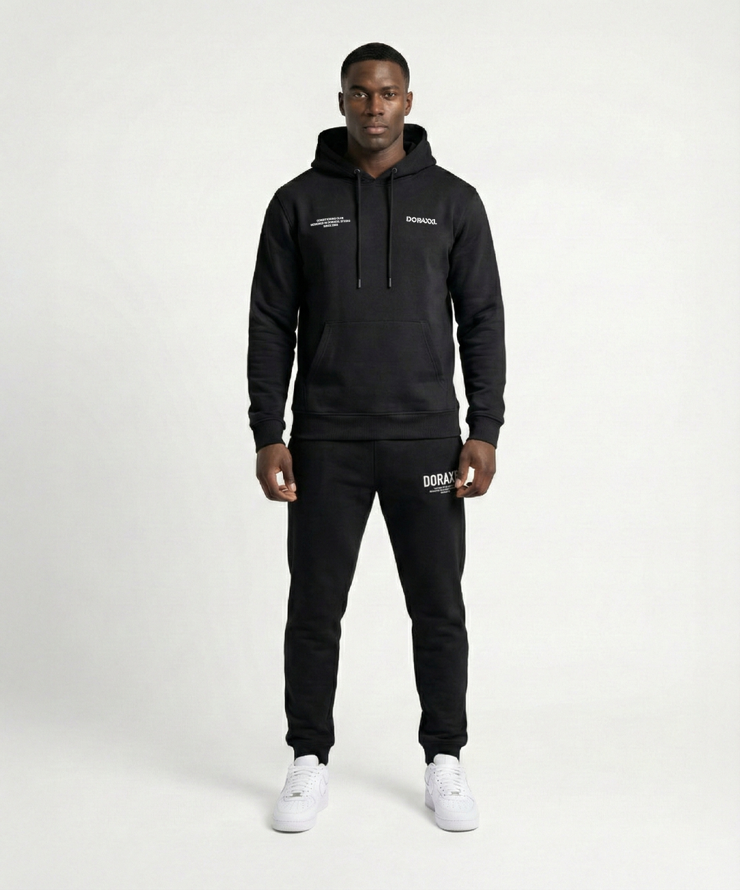 A clean, modern streetwear essential designed for confidence and comfort. The Noir Atlas Set features a deep-black hoodie with minimalist chest detailing and a relaxed kangaroo pocket, paired with tapered joggers that create a sharp, athletic silhouette. The subtle branding keeps the look refined, while the structured fit and soft fabric make it ideal for both casual wear and elevated off-duty style. Finished with crisp white sneakers, this outfit balances urban edge with timeless simplicity.